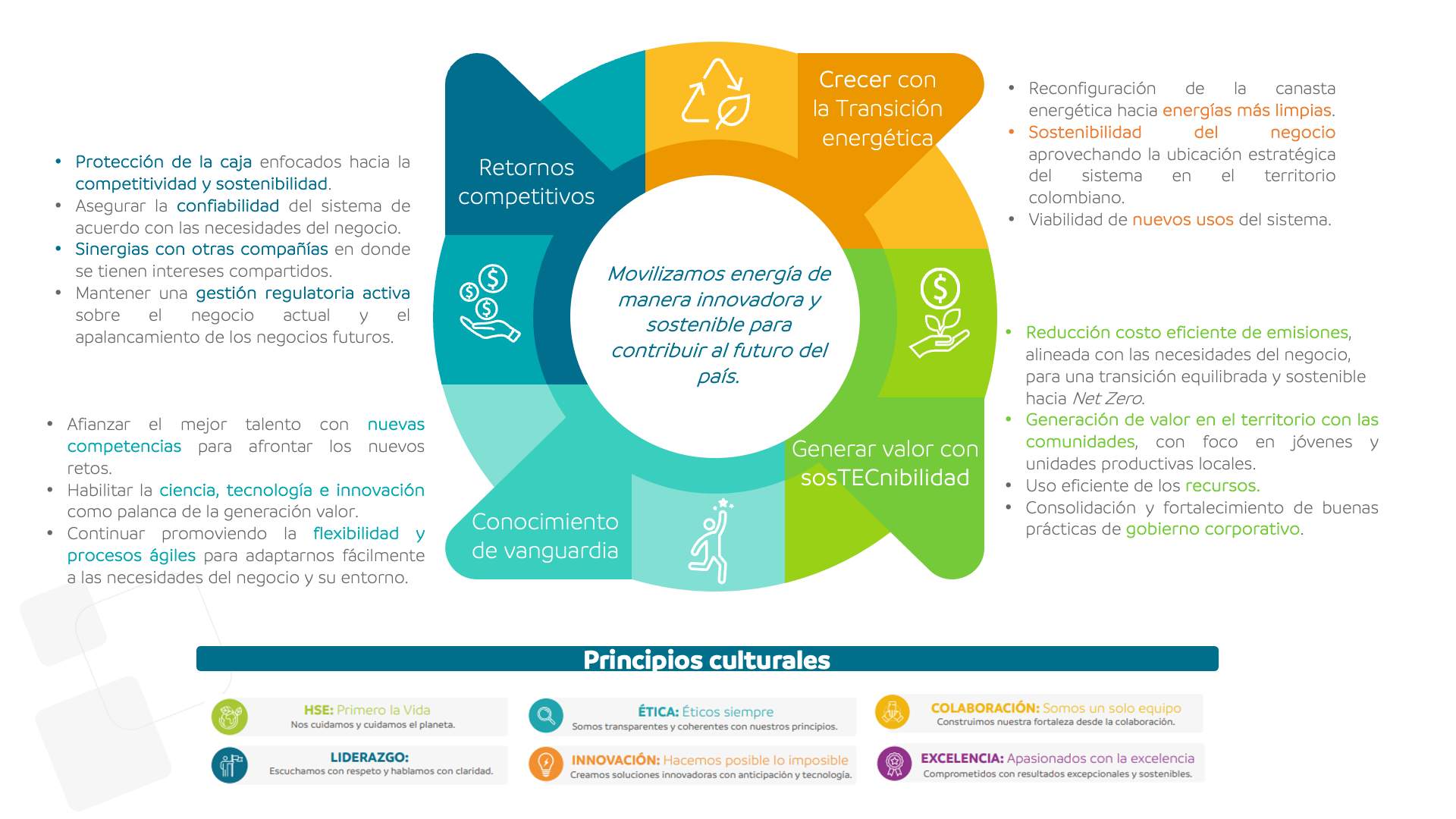 4 pilares enmarcan nuestra razón de ser y propósito, el compromiso con el desarrollo del negocio, la estrategia corporativa y en el marco de la transición energética.